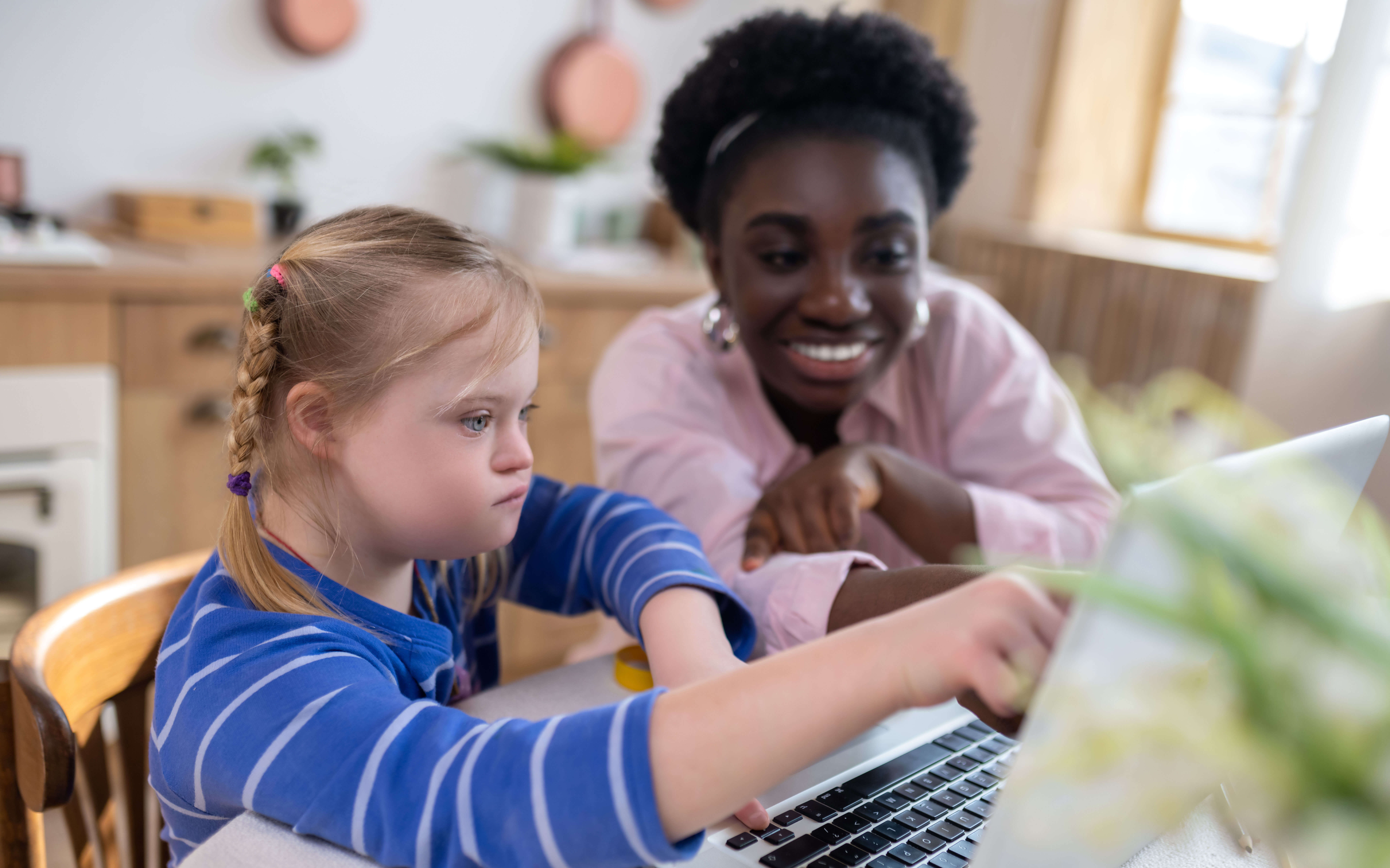 Home schooling. A girl with down syndrome having a lesson with her teacher and looking involved