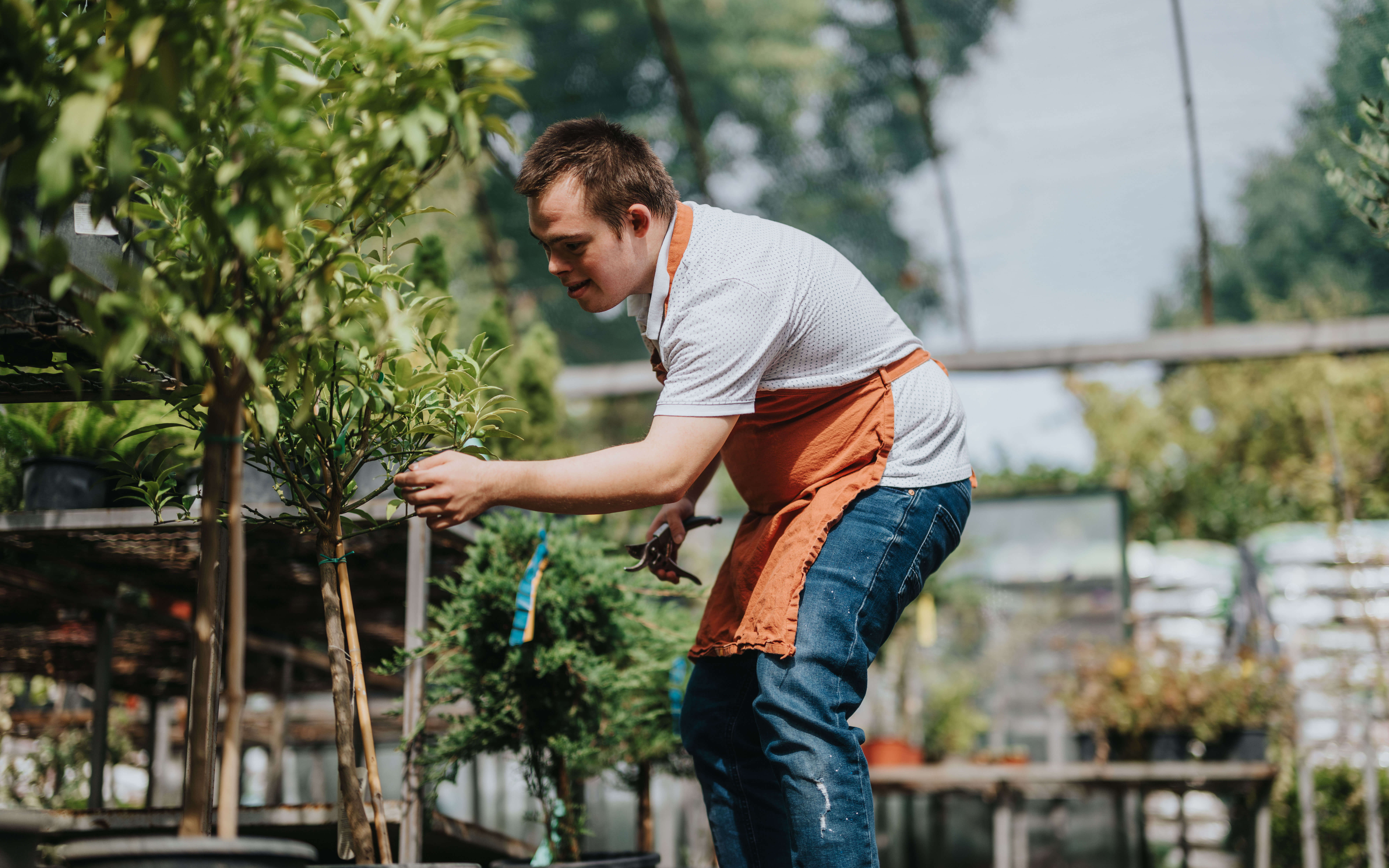 A dedicated young gardener with down syndrome carefully tending to plants in a greenhouse setting. This scene showcases inclusion, passion for nature, and the joy of gardening.